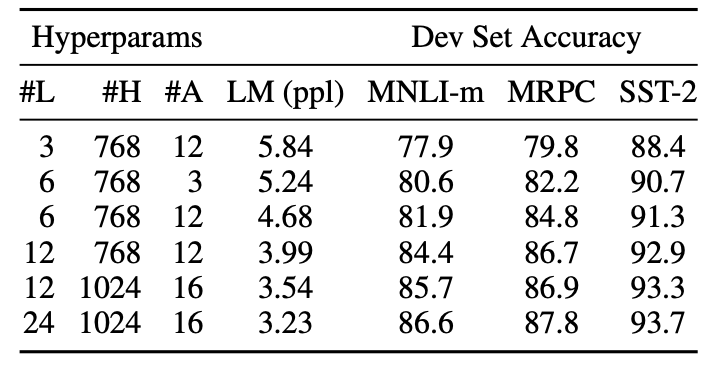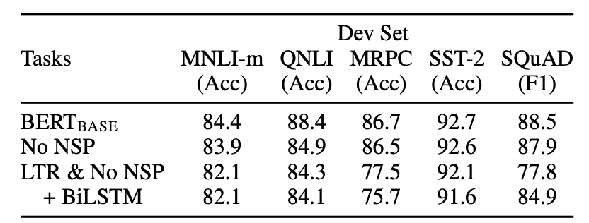 2,3의 비교를 통해 MLM의 효과를 확인할 수 있으며, 1,2의 비교를 통해 NSP의 효과 또한 확인할 수 있다.