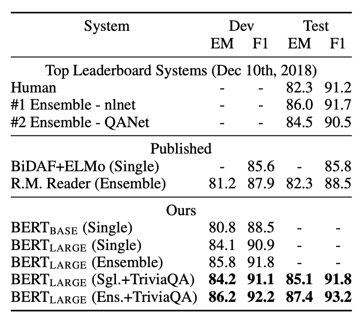가장 좋은 성능을 보인 모델은 BERT-Large 모델을 앙상블하고 TriviaQA dataset을 통해 먼저 fine-tuning한 모델로, 인간보다도 좋은 판단 능력을 보여줬다.