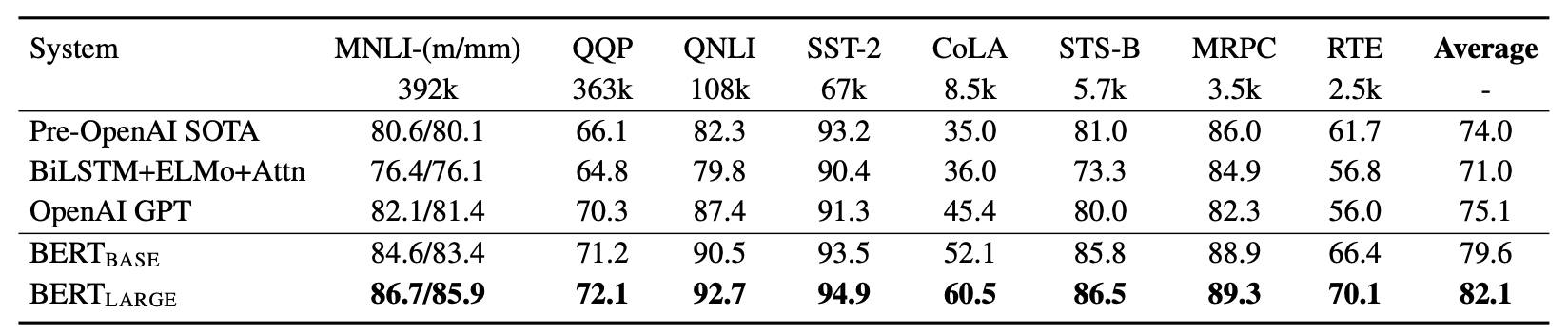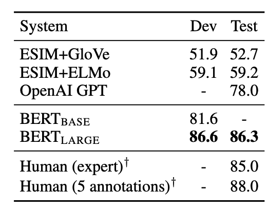 특히 BERT-Large는 다른 어떤 모델보다 특히 우수한 성능을 보였다.