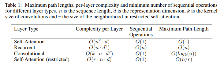self-attention layer는 계산 복잡도 면에서 n < d 일때 recurrent layer보다 빠르다.