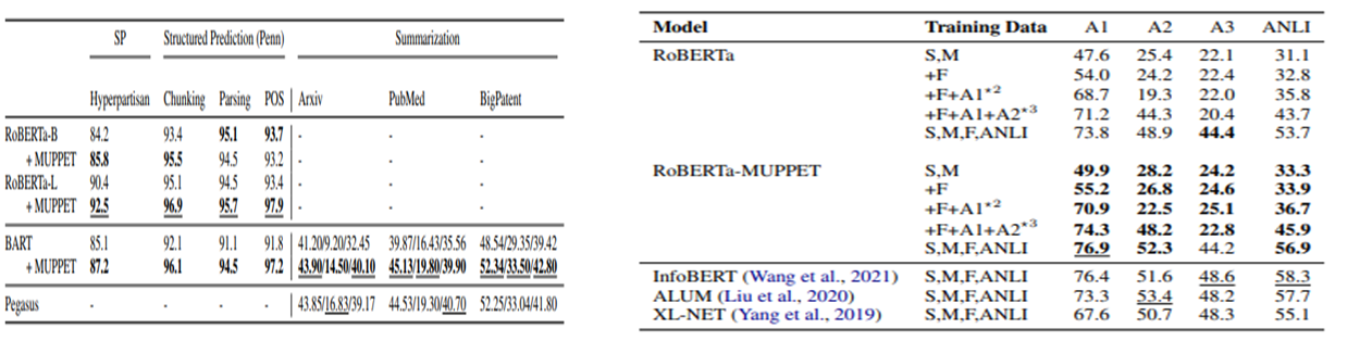 Muppet은 새로운 Multi-task Learning 학습을 소개하며 Roberta와 Bart Pre-training 모델을 선택하여 추가로 Pre-finetuing을 적용하여 대규모 Multi-task Learning 및 각 성능의 향상을 보여준다.
